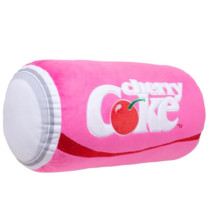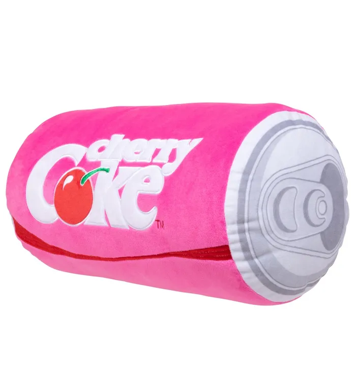 Add to your home’s décor with this soft pillow shaped like a large can of Cherry Coke with embroidered logo. One end of the pillow features a screen print of the top of a soda can.