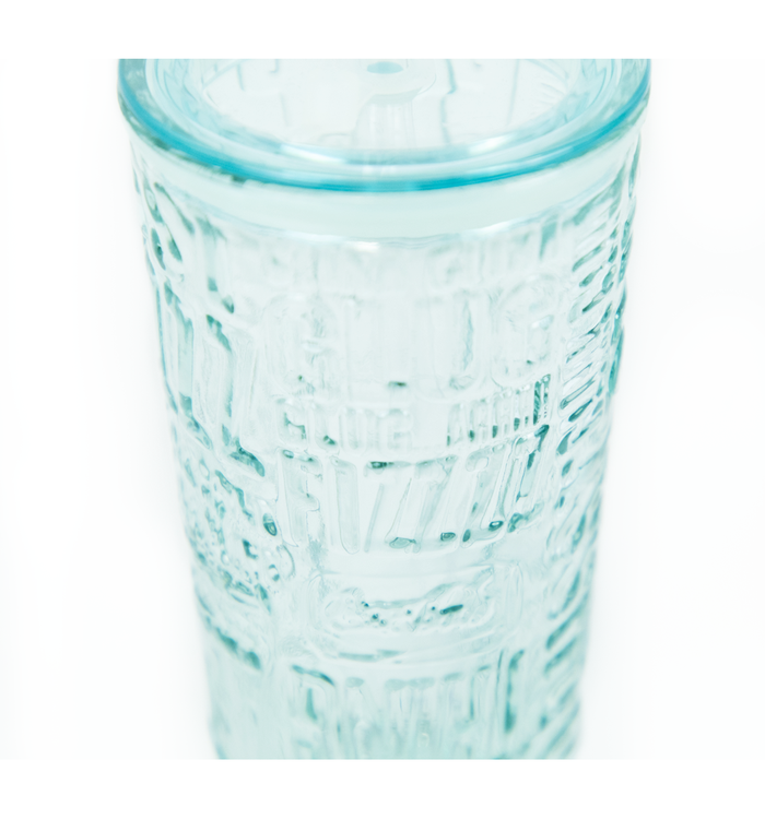 This is one in a series of green glassware handmade from recycled glass in Spain. They feature the script logo and other decorations embossed in the glass. This piece is a 17oz. tumbler with straw that has the bottle and the pop/fizz artwork in an all over embossed detail.